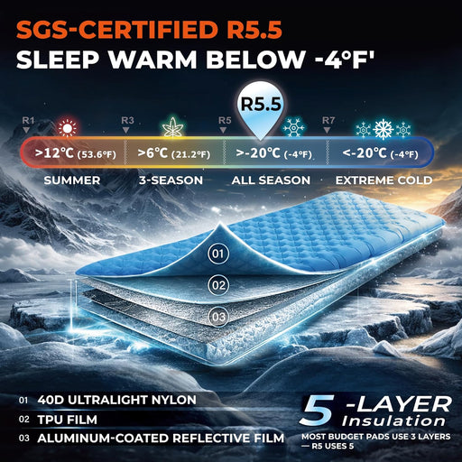 Sleep warm on any terrain with the TREKOLOGY ALUFT R5. This silent, 4” thick pad features an SGS-certified 5.5 R-Value to block ground chill. Spaci...