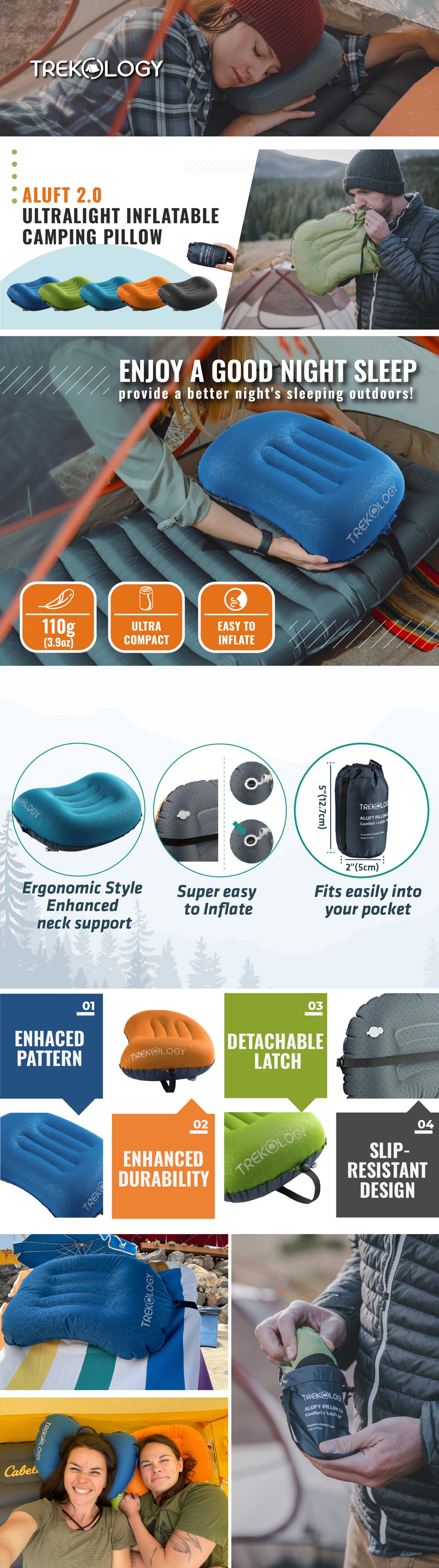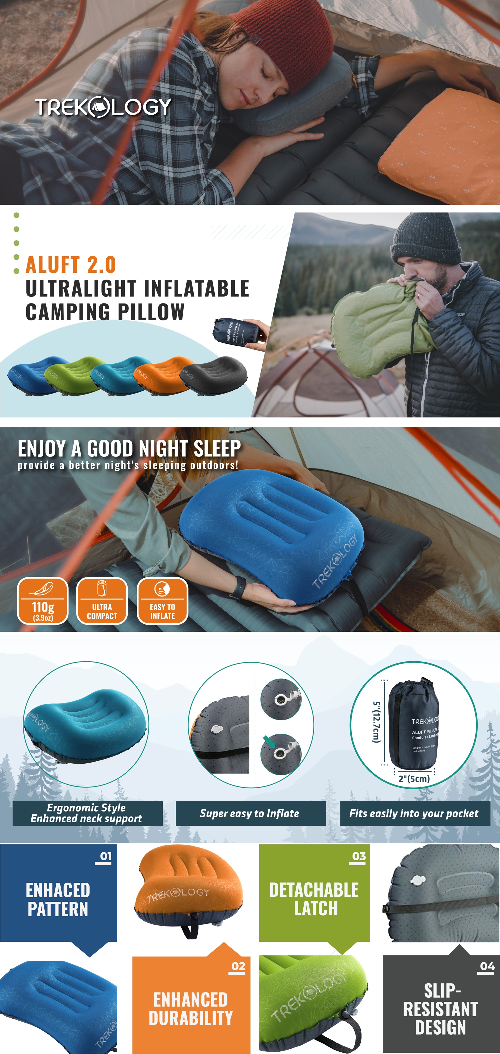 Experience a revolutionary upgrade in portable comfort with the TREKOLOGY ALUFT 2.0. This pillow delivers enhanced ergonomic neck support for a truly restful sleep, yet is so ultralight and compact it packs down smaller than a soda can. Our innovative non-slip design keeps it securely in place all night, while the durable, water-resistant fabric is built for any adventure. With effortless inflation in just a few breaths, it's the ultimate hassle-free solution for premium comfort on the go.
