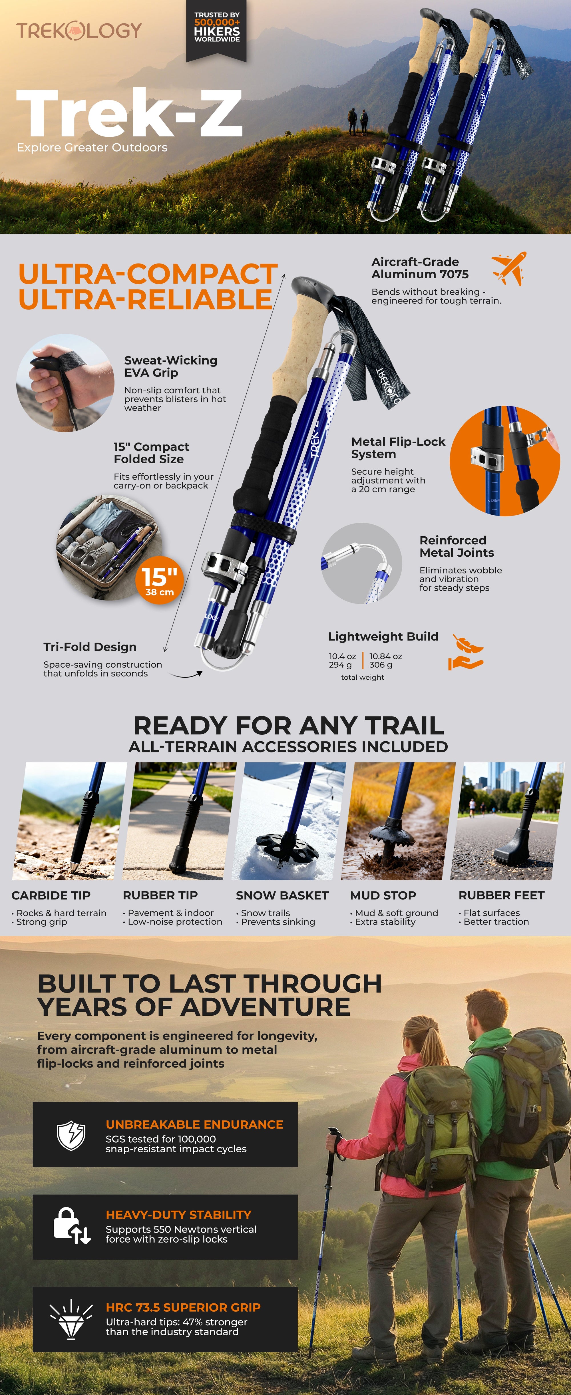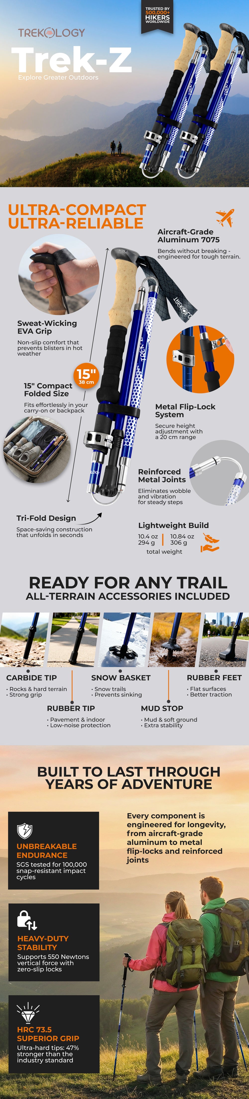 Available in 2 different adjustable lengths. Compact and lightweight trekking poles that fits in your backpack and carry-on luggage.